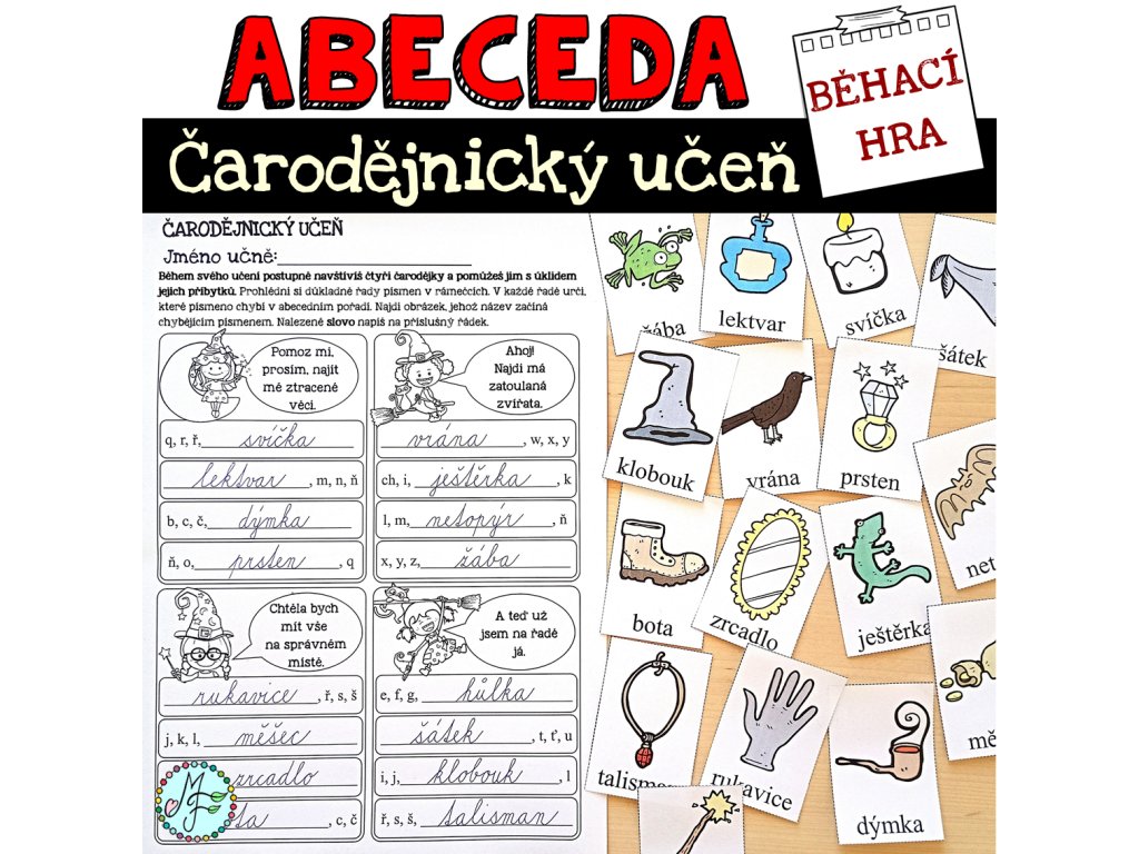 Vytiskněte stránku s vybranou variantou obrázků čarodějnických věcí a zvířat (černobílou nebo barevnou) a nastříhejte na kartičky. Kartičky rozmístěte v herním prostoru (ve třídě nebo na chodbě). Děti dostanou pracovní list, ve kterém mají za úkol pomoci čarodějkám s úklidem jejich příbytků. U každé čarodějky jsou čtyři řádky s písmeny a s vynechanými slovy. Děti určí, které písmeno v řádku chybí (podle abecedního řazení). Najdou v herním prostoru kartičku s obrázkem, jehož název začíná tímto písmenem. Nalezené slovo napíší do příslušného řádku. Děti, které nemohou „běhat“ po třídě, mohou hledat slova přímo na vytištěné (nerozstříhané) stránce s obrázky. Když mají hráči doplněno všech 16 slov, začnou vyplňovat pracovní list pro rychlíky.