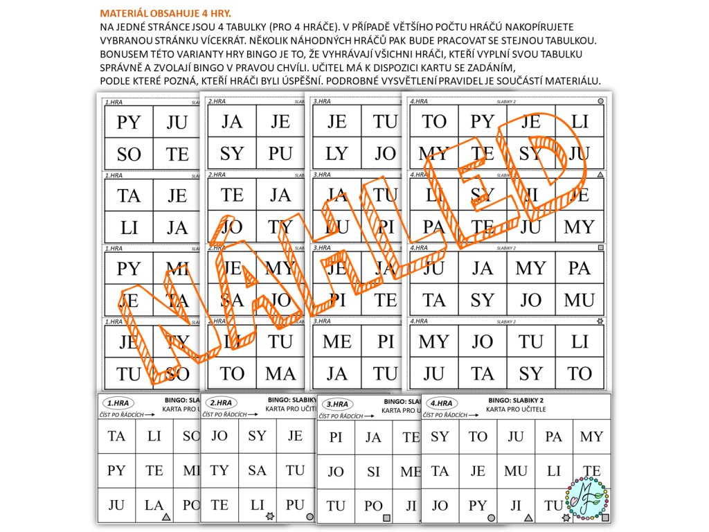 Učitel čte po řádcích slabiky z KARTY PRO UČITELE a hráči hledají políčko se správnou slabikou ve svých TABULKÁCH. Když políčko najdou, tak ho přeškrtnou. Takto hra pokračuje dále, dokud nejsou všechna políčka v tabulce vyškrtaná. Jakmile hráči škrtnou poslední políčko ve své tabulce, zavolají BINGO a přinesou tabulku učiteli. Učitel podle KARTY PRO UČITELE jednoduše zkontroluje, zda hráči skončili ve správnou chvíli – pozná to podle SYMBOLU v pravém horním rohu na kartě hráče.