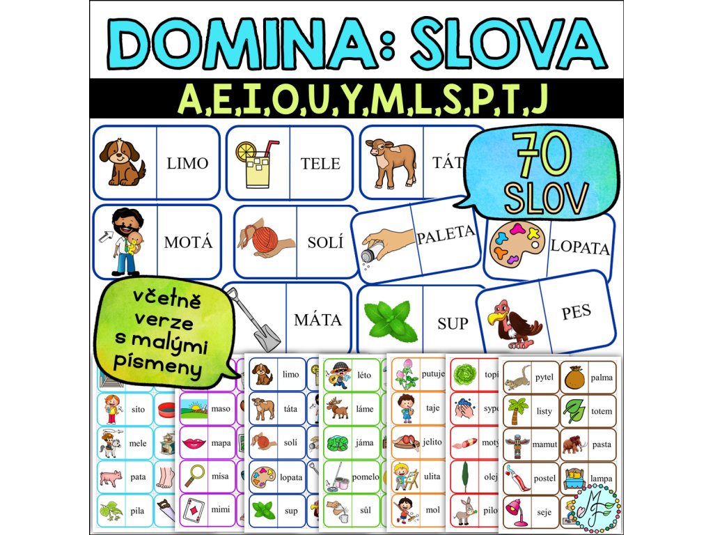 Materiál obsahuje 7 domin k procvičení čtení slov s písmeny a,e,i,o,u,y,m,l,s,p,t,j. Součástí je verze s velkými písmeny i verze s malými písmeny.