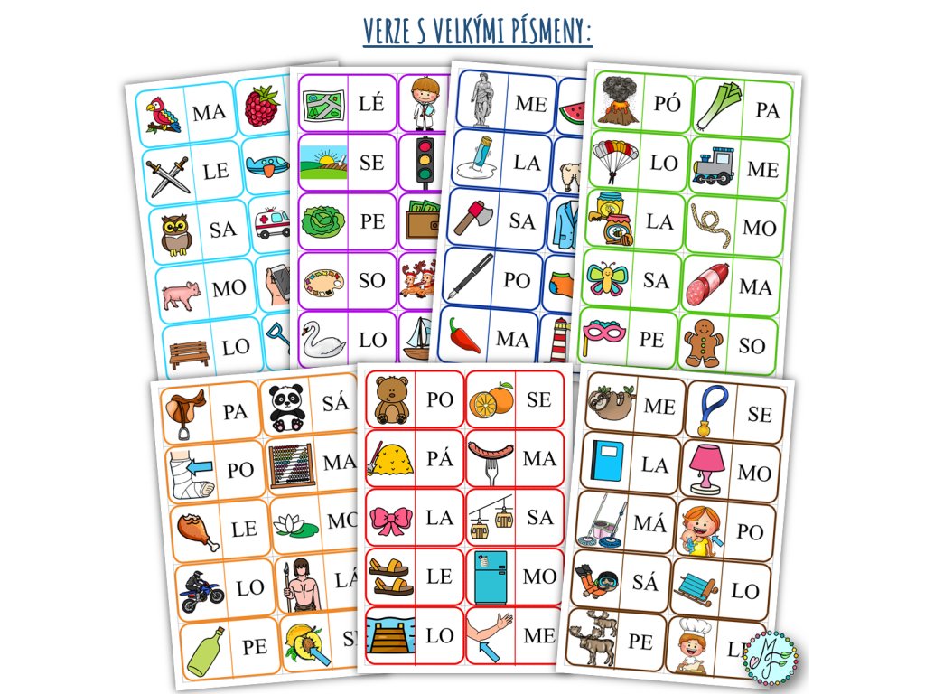 Materiál obsahuje 7 domin k procvičení čtení slabik s písmeny M, L, S, P, A, E, O. Všechna domina jsou ve verzi s velkými písmeny i ve verzi s malými písmeny.