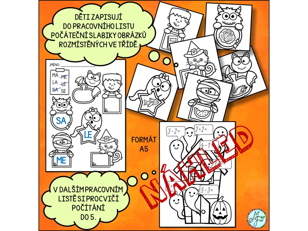 V prostoru třídy nebo chodby rozmístěte kartičky s obrázky. K připevnění můžete použít lepící gumu nebo samolepící etikety. Dětem rozdejte pracovní listy. Úkolem dětí je najít ve třídě kartičku s halloweenskou bytostí, určit první slabiku obrázku, který daná bytost drží v rámečku. Danou slabiku pak děti napíší ke stejné bytosti ve svém pracovním listě. Na pracovním listě je vlevo nahoře uvedena nápověda, které slabiky je třeba doplnit. V nápovědě si pak mohou děti škrtat slabiky, které již zapsaly. Stránku s duchy a příklady doporučuji vytisknout z druhé strany. Jakmile děti dopíší slabiky, otočí list a napíší výsledky k příkladům, které zadávají duchové ve strašidelném domě. Pak si děti mohou obrázky vybarvit.