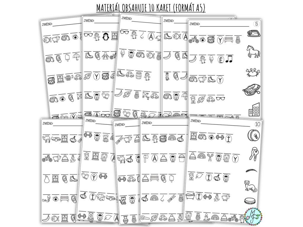 V pracovních listech jsou použita písmena A,E,I,O,U,Y,M,L,S,P,T,J,N,V,Z,D,K,Š,R,C,H,B,Č.