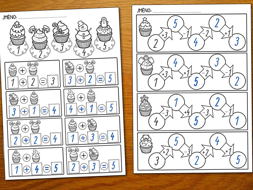 Děti řeší příklady na sčítání (v oboru do 5) tak, že pod obrázky dortíků zapisují čísla, která jsou uvedena u dortíků na úvodním obrázku. Po doplnění čísel i znamének příklad vypočítají.