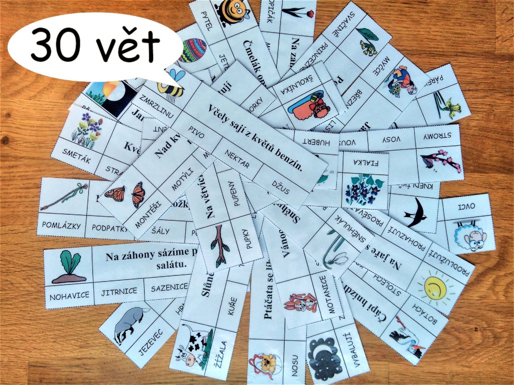Karty mohou děti brát ze společné zásoby, případně můžete věty rozmístit v prostoru třídy a využít k běhacímu diktátu (dítě se pohybuje v prostoru třídy, vybere si větu, dá ji v hlavě do pořádku, zapamatuje si ji, vrátí se na své místo a větu napíše do sešitu).