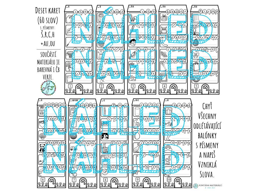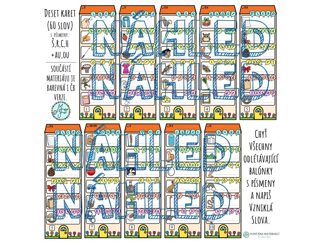 - Deset karet s úkoly k procvičení písmen Š,R,C,H a dvojhlásek AU,OU (barevná i čb varianta)
