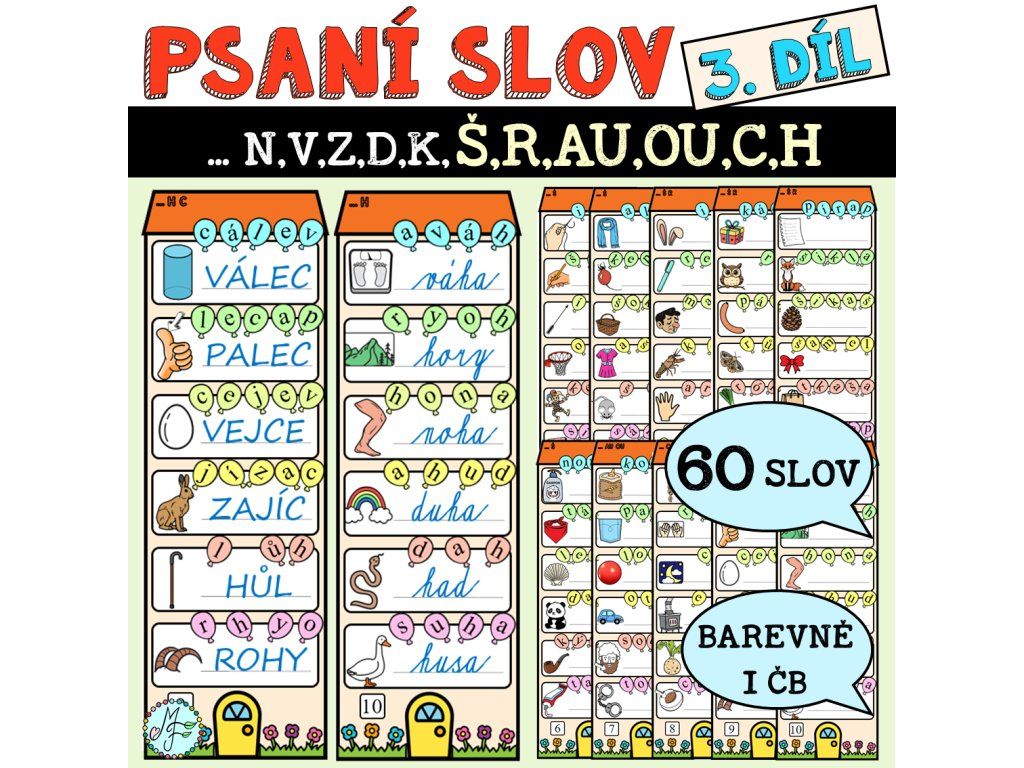 Materiál slouží k procvičování psaní slov. Tento díl je zaměřen hlavně na písmena š,r,c,h, na dvojhlásky au, ou a na slova s uzavřenou slabikou na začátku (panda).