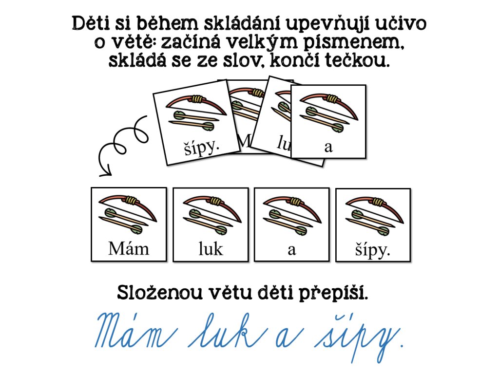 Při práci s materiálem si děti upevňují učivo o větě: začíná velkým písmenem, skládá se ze slov a končí tečkou. V materiálu jsou věty oznamovací a rozkazovací. Poskládané věty mohou děti přepsat (zpočátku velkým tiskacím písmem, po osvojení potřebných psacích tvarů i psacím písmem).