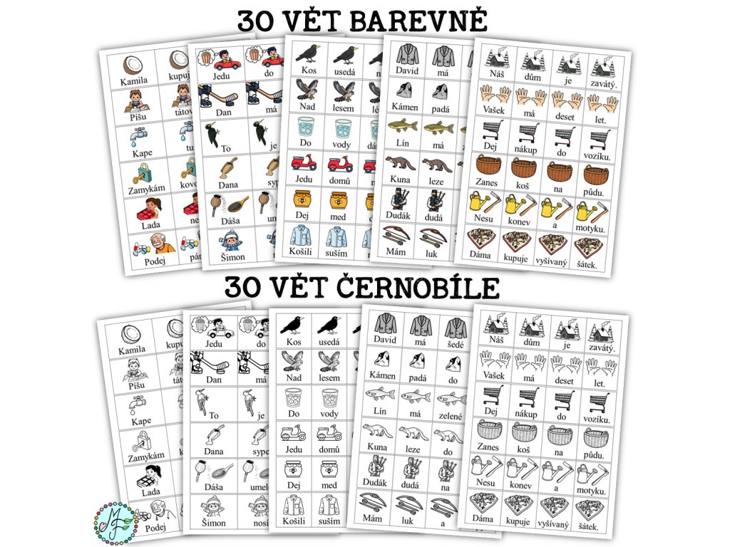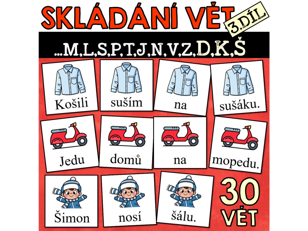 Materiál obsahuje 30 vět k procvičení čtení a psaní slov s písmeny: a,e,i,o,u,y,m,l,s,p,t,j,n,v,z,d,k,š. Dvanáct vět se skládá ze tří slov, osmnáct vět má čtyři slova. Každá věta je doprovázena obrázkem, součástí materiálu je barevná i čb verze.