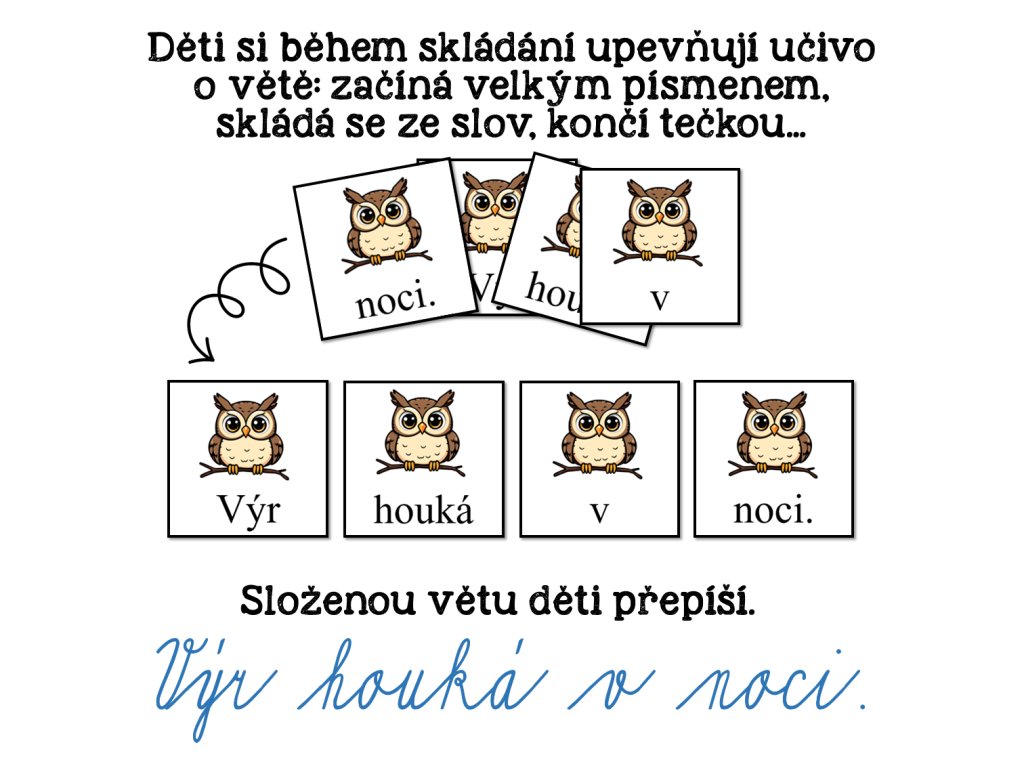 Při práci s materiálem si děti upevňují učivo o větě: začíná velkým písmenem, skládá se ze slov a končí tečkou/otazníkem. Poskládané věty mohou děti přepsat (zpočátku velkým tiskacím písmem, po osvojení potřebných psacích tvarů i psacím písmem).