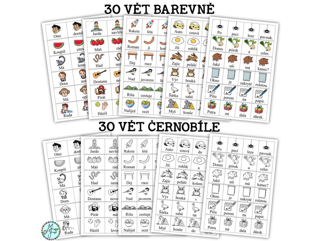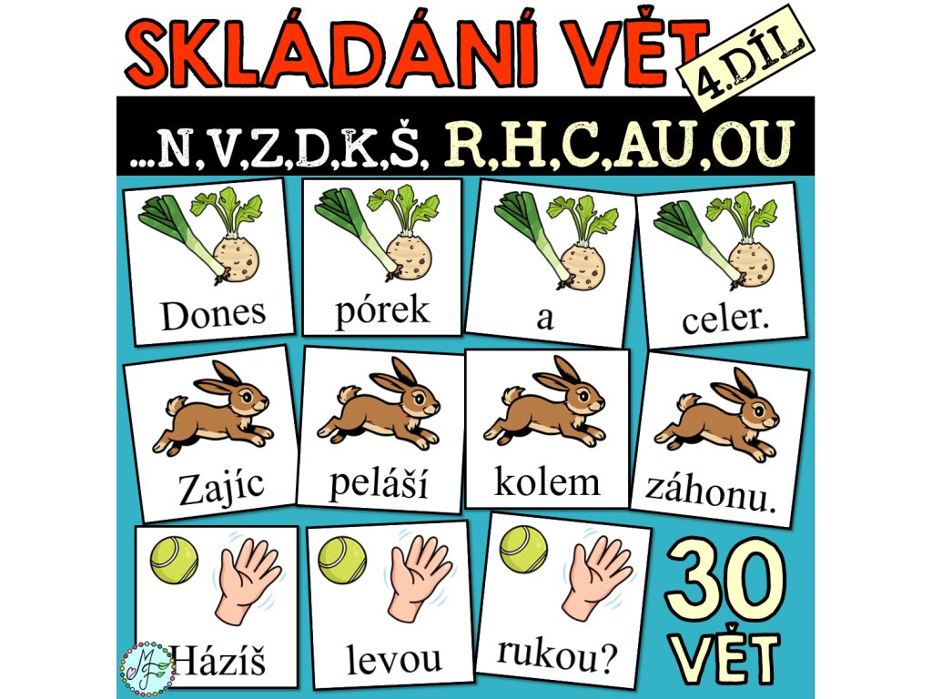 30 vět k procvičení čtení a psaní slov s písmeny: a,e,i,o,u,y,m,l,s,p,t,j,n,v,z,d,k,š,r,c,h a s dvojhláskami au,ou. Materiál obsahuje 12 vět se třemi slovy a 18 vět se čtyřmi slovy. Věty jsou oznamovací, rozkazovací (končící na tečku) a tázací. Součástí materiálu je barevná i čb verze.