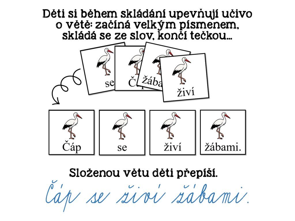 Do každého uzavíratelného sáčku vložte jednu nastříhanou větu a sáčky umístěte do společné zásoby ve třídě. Každé dítě si vezme jeden sáček, poskládá větu a přepíše ji do sešitu nebo na stírací tabulku. Zpočátku mohou děti přepisovat věty velkým tiskacím písmem, po osvojení potřebných psacích tvarů i psacím písmem. Po zapsání věty dítě uklidí kartičky zpět do sáčku a sáček vrátí do společné zásoby. Vezme si další sáček a stejným způsobem pokračuje. Podle obrázků pozná, se kterými větami již pracovalo. Děti je možné motivovat tak, že např. za každé tři bezchybně napsané věty dostanou jedničku. Přínos této metody je v tom, že každý pracuje svým tempem a práci všech dětí je možné ukončit téměř ve stejnou chvíli (někdo stihne napsat více vět, jiný méně).