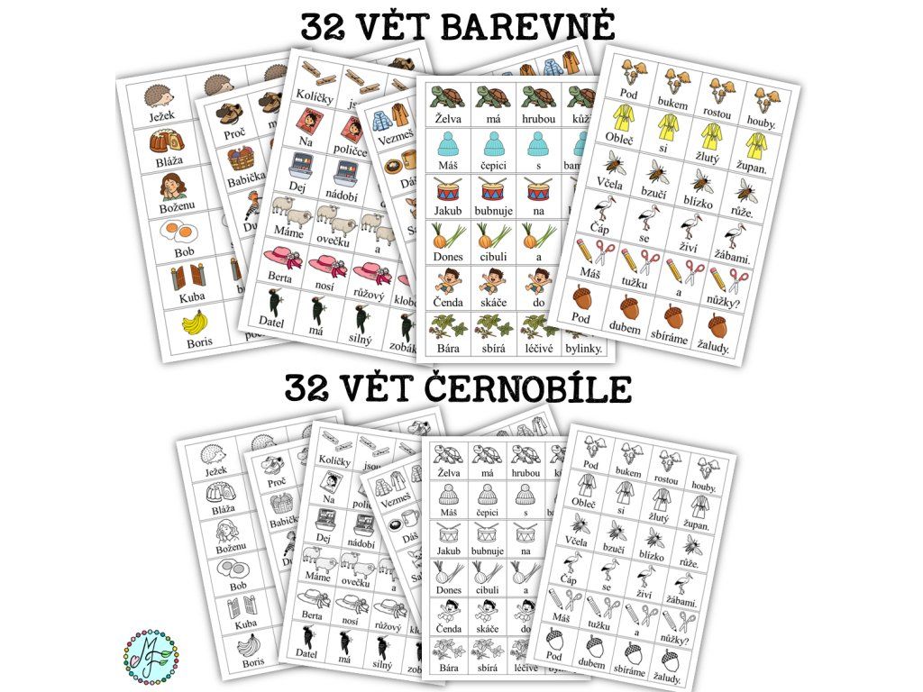 32 vět k procvičení čtení a psaní slov s písmeny: a,e,i,o,u,y,m,l,s,p,t,j,n,v,z,d,k,š,r,c,h,b,č,ž. Materiál obsahuje 6 vět se třemi slovy a 18 vět se čtyřmi slovy a 8 vět s pěti slovy. Věty jsou oznamovací, rozkazovací a tázací.
