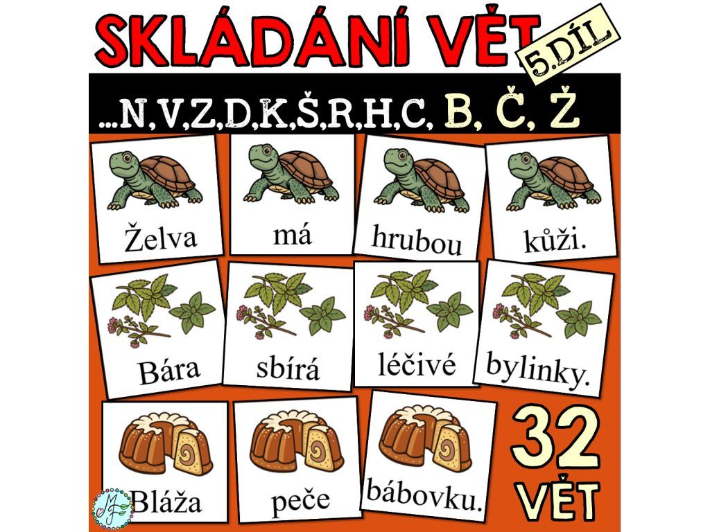 Při práci s materiálem si děti upevňují učivo o větě: začíná velkým písmenem, skládá se ze slov a končí tečkou/otazníkem/vykřičníkem. Poskládané věty děti mohou přepsat do sešitu. Tento díl je zaměřen hlavně na procvičování písmen: B,Č,Ž.